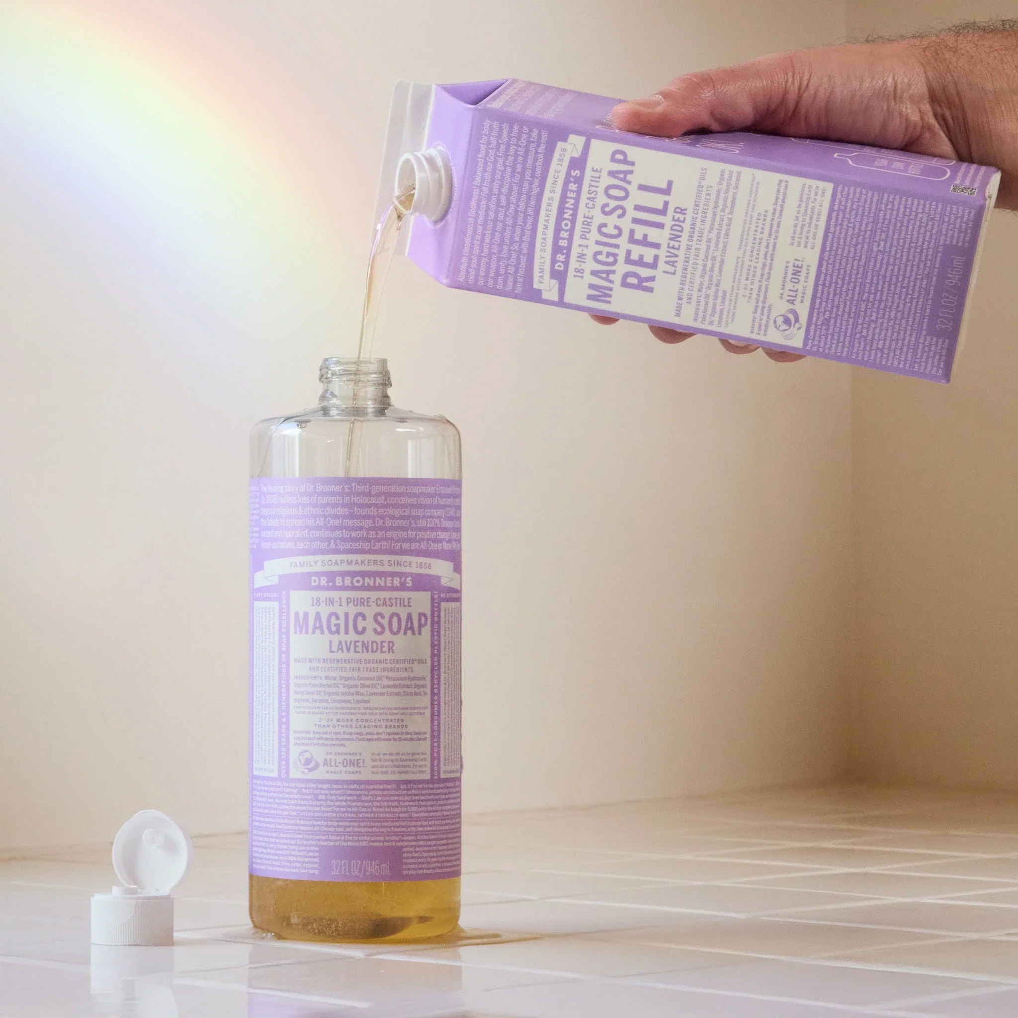 Relax and unwind with the calming scent of Dr. Bronner’sLavenderLiquid Soap. Infused with pureFrenchlavender essential oil, thistruesoapcreates a rich, smooth lather that rinses clean. Made withRegenerative Organic Certified®oils, it gently cleanses while filling the air with a soothing, genuine scent.No detergents, dyes, or added foaming agents.Vegan, made with organic oils, fair trade, and EWG Verified®—for a clean that renewsbody and soul.