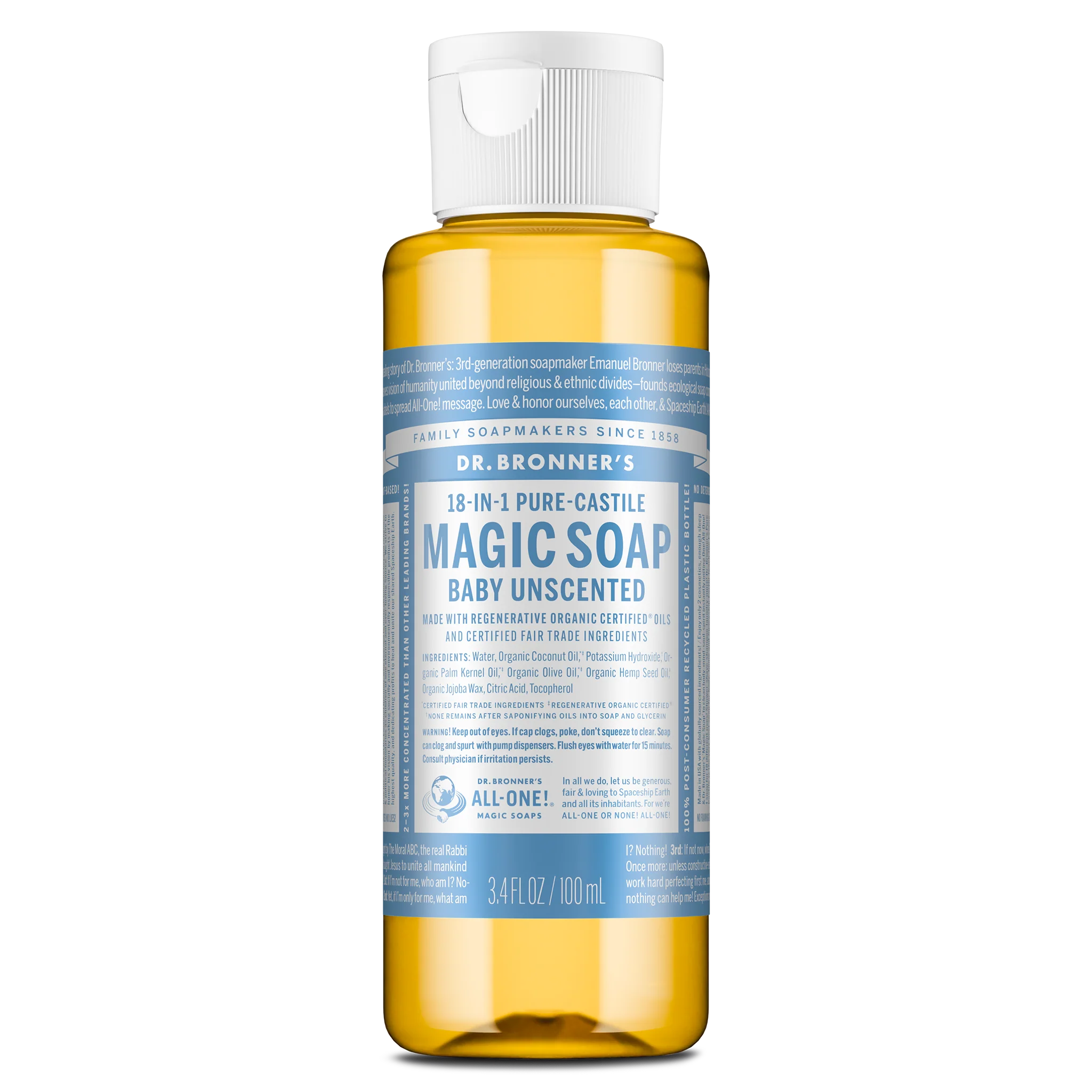 Gentle yet effective, Dr. Bronner’s Baby Unscented Liquid Soap is great for sensitive skin. Made with a nourishing blend of Regenerative Organic Certified® oils and double the olive oil, this true soap creates a rich, luxurious lather that rinses clean. Free from added fragrance, it’s ideal for babies (when diluted) and anyone sensitive to scents. Crafted with organic, ethically sourced ingredients and no detergents, dyes, or foaming agents. Vegan, made with organic oils, fair trade, and EWG Verified® for a safer, more sustainable clean—for you and your family!